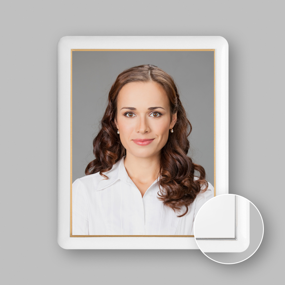 profil produktu je hladký a mírně vypouklý s tloušťkou cca 5 mm, zaoblení rožků má poloměr 3 mm, kolem fotografie je zlatá nebo stříbrná linka. Drátěný stojánek nelze použít pro plakety menší než 7 x 9 cm.